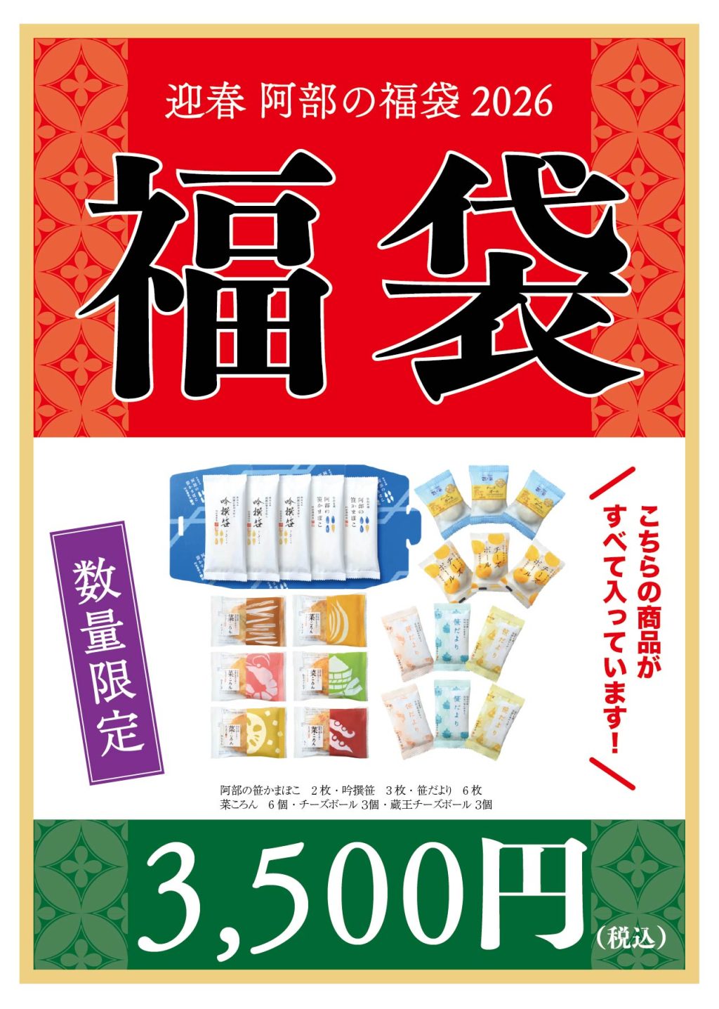 2026年1月1日(木)~1月3日(土)の期間中、阿部蒲鉾店対象店舗で税込3,500円以上お買い上げのお客様に「阿部蒲鉾店お正月ノベルティ」をプレゼントいたします。