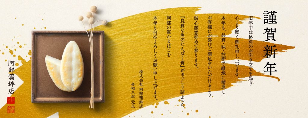 本年も、品質・味・技術の継承に精進しお客様にお喜びご満足をいただけるよう、精神誠意努めて参ります。『良質な魚のたんぱく質』がぎっしり詰まった阿部の笹かまぼこを本年も何卒よろしくお願い申し上げます。