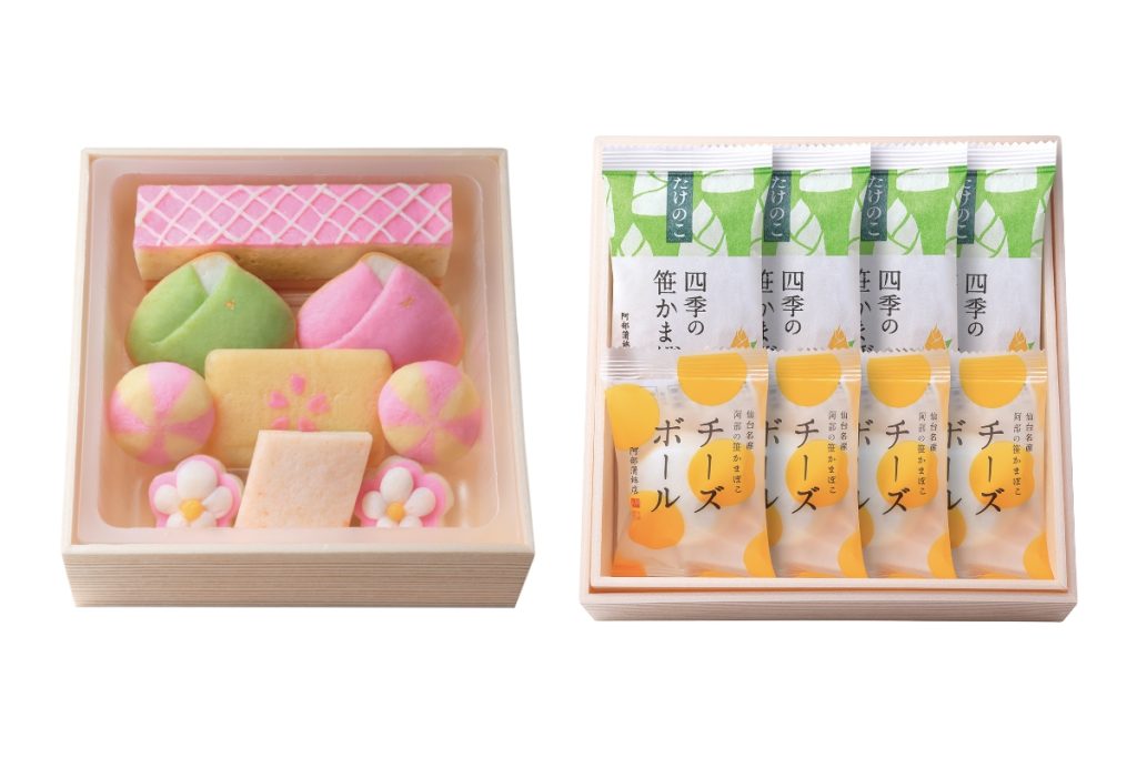 三段目:阿部の笹かまぼこ2枚・四季の笹かまぼこ【たけのこ】3枚・チーズボール2個
